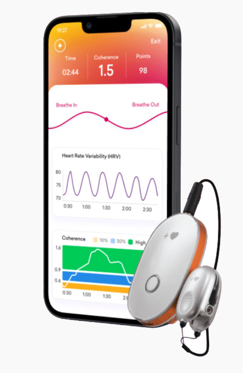The optional Inner Balance is a personal HRV training device that displays your heart rhythm in real time. As you adjust your breathing and emotional focus, you can watch your heart rhythm shift from stress to greater coherence.